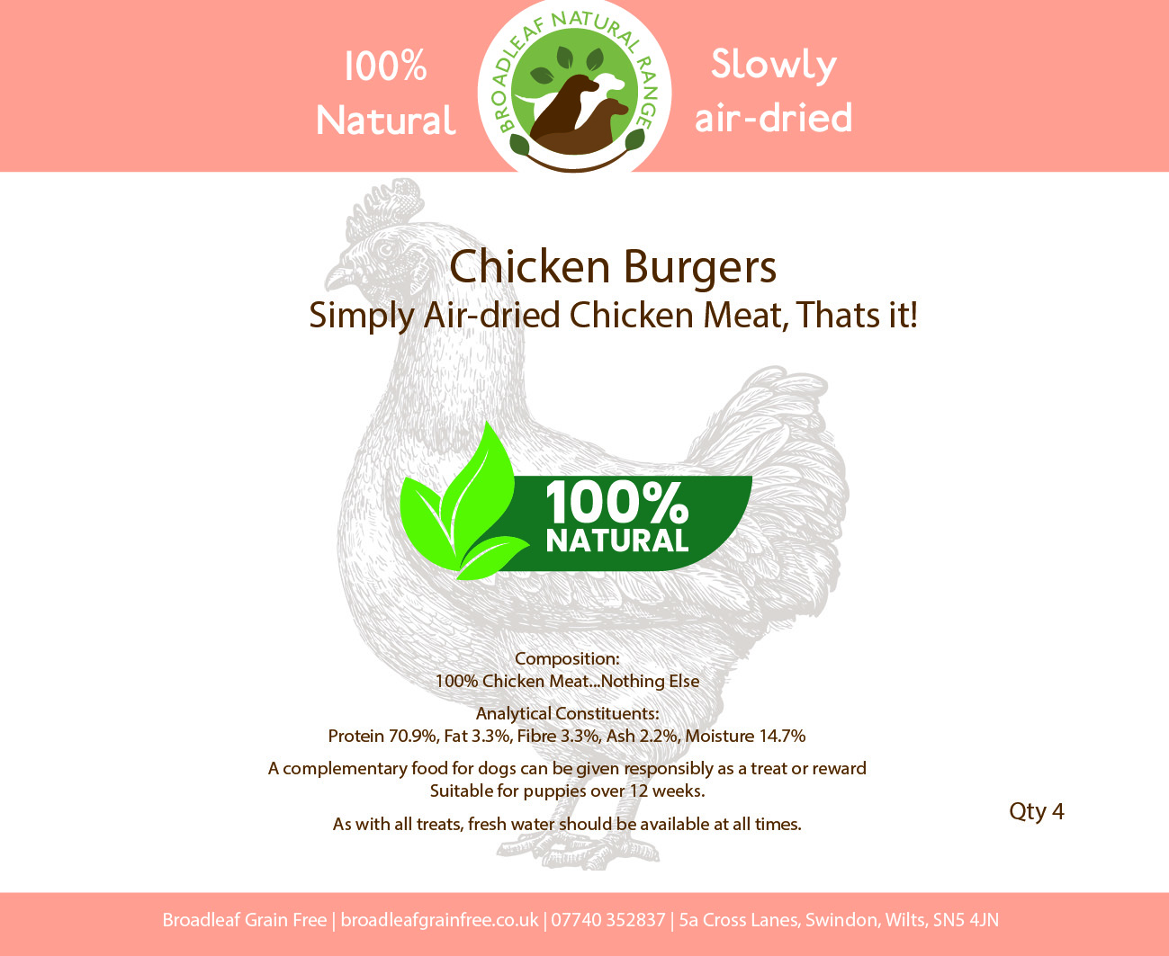 High in protein and low in fat, a great source of vitamins and minerals, these premium chicken burger treats make an excellent addition to your dog’s natural diet.